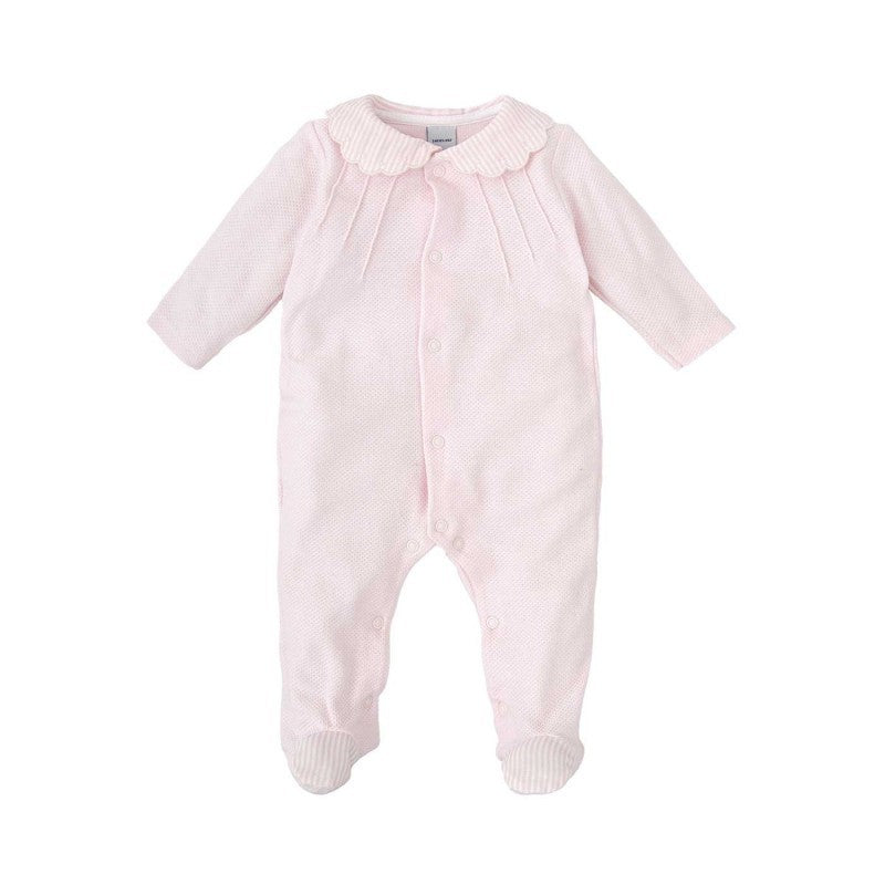 Het pakje is afgewerkt met een subtiel gestreept kraagje dat een elegante en speelse uitstraling geeft. Dankzij de handige drukknoopjes op de voorkant is aankleden en verschonen extra eenvoudig.