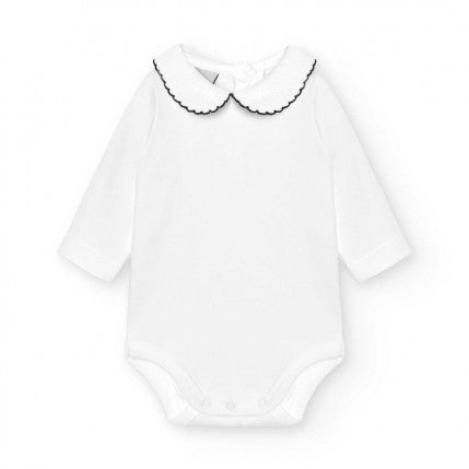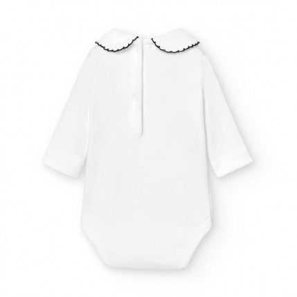 De romper/body is van super zacht jersey katoen en is afgewerkt met een mooie ronde kraag in piqué stof, het kraagje is afgewerkt met een donkergroen randje. (kleur is lastig te fotograferen, maar is mooi diep donkergroen), De romper heeft lange mouwen