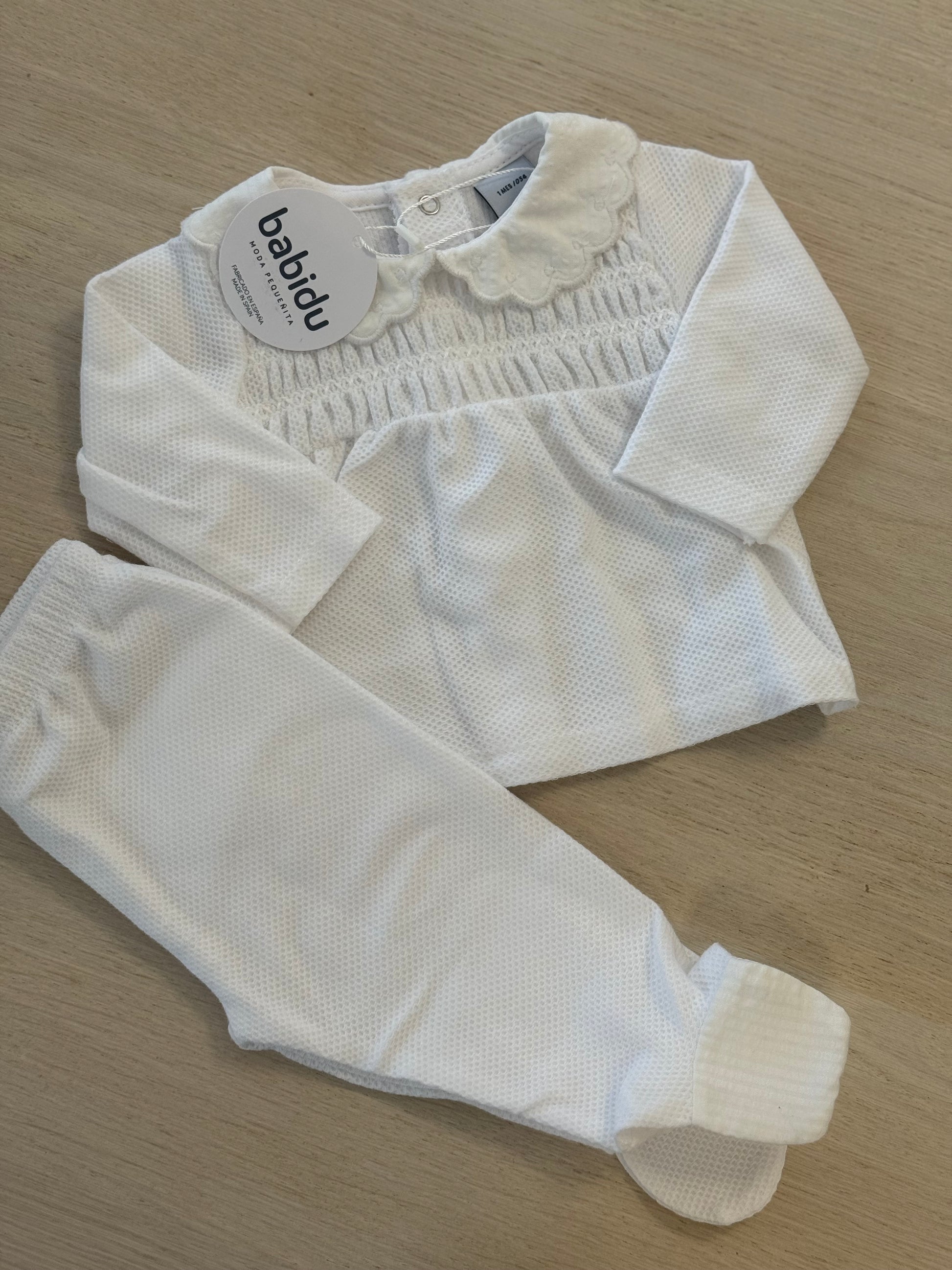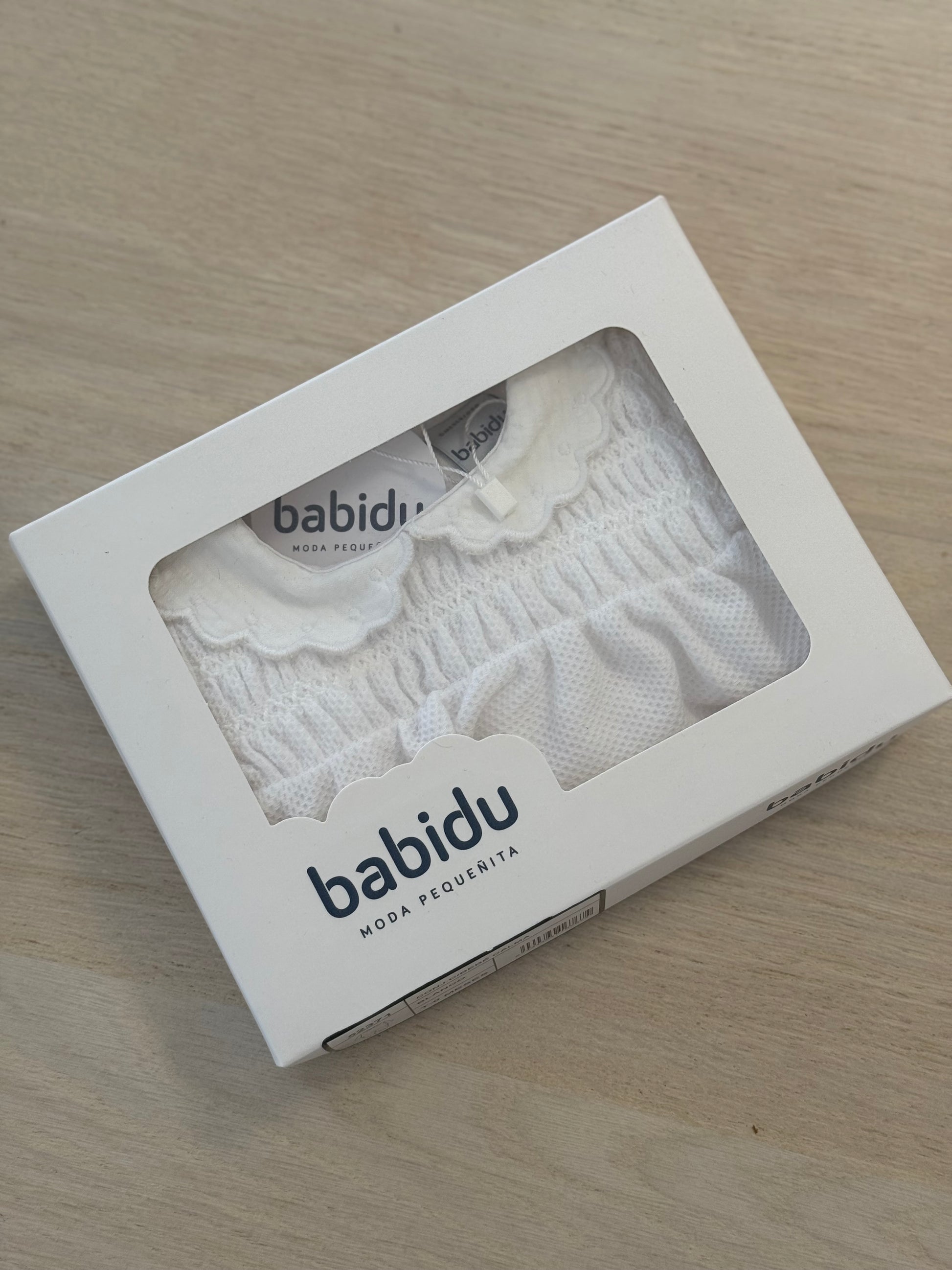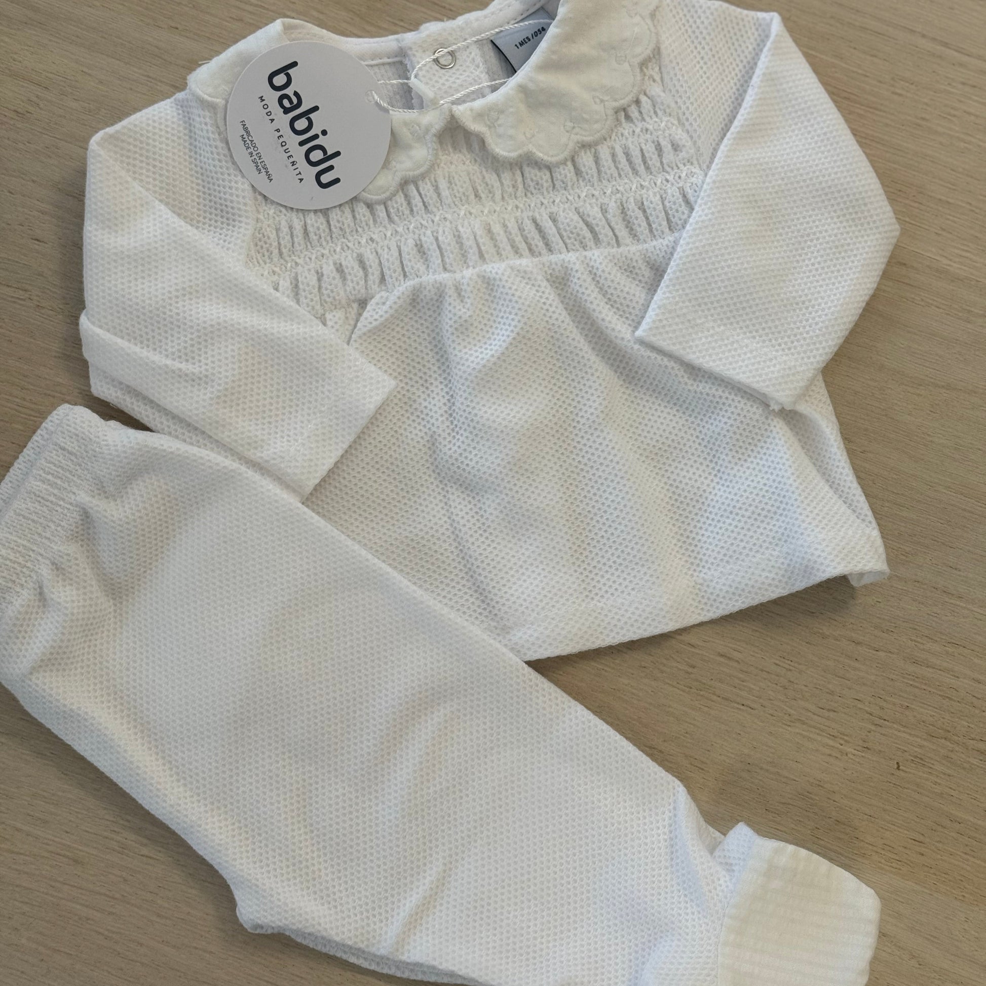 Dit lieve Babidu setje bestaat uit een wit broekje en een bijpassende top, gemaakt van hoogwaardig katoen. Het ademende en huidvriendelijke materiaal voelt heerlijk comfortabel aan, perfect voor de gevoelige babyhuid.