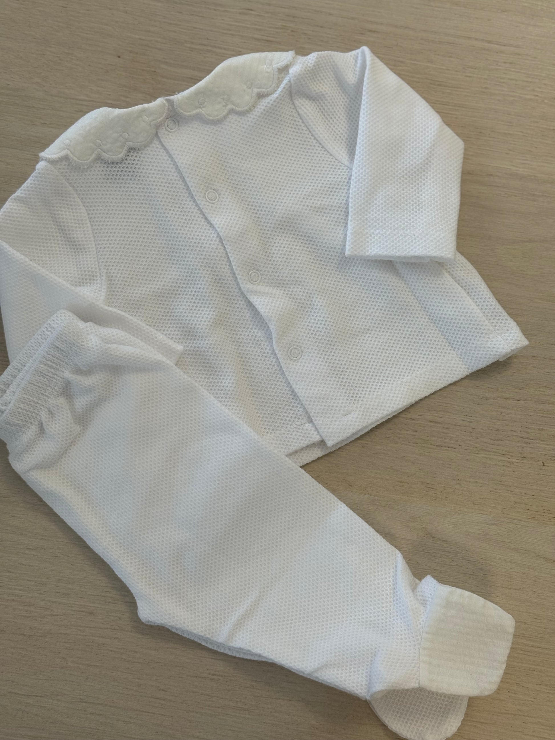 De top is voorzien van een subtiel gestreept kraagje dat het setje een speelse en elegante uitstraling geeft. Dankzij de praktische drukknoopsluiting op de rug is het aankleden eenvoudig en comfortabel. Het broekje heeft een zachte tailleband voor extra draagcomfort.